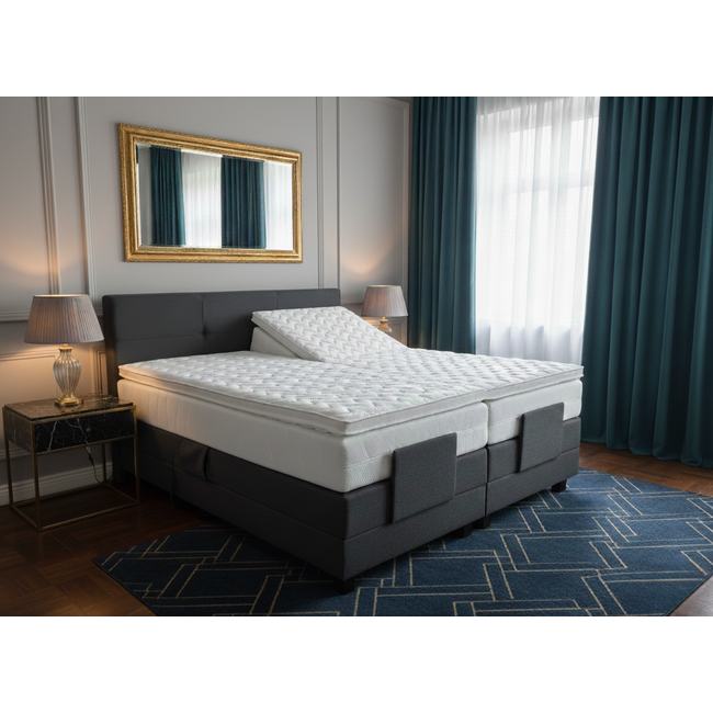 De elektrische boxpring heeft een pocket geveerde kern en de boxen hebben een kwalitatief en technisch hoogwaardige Dewert duomat motor aandrijving. (Gelijkstroommotoren, lage spanning 24 v.)
