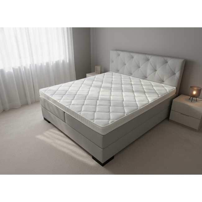 De boxspring heeft een pocket geveerde kern, met 7 slags geharde veren.